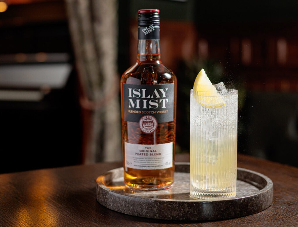 Fyll ett högt glas med is Häll upp 4cl Islay Mist Fyll upp med soda vatten Garnera med en citronklyfta